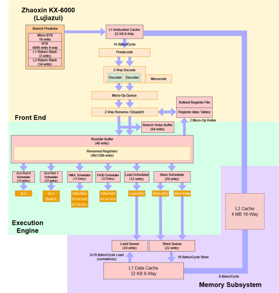 В LuJiaZui сузили ширину декодирования с 3 (в Isaiah) до 2 команд, так как хотели добиться более высокой тактовой частоты, снижения энергопотребления и уменьшения площади на кристалле. Иначе создать восьмиядерный чип с приемлемым энергопотреблением и площадью кристалла у Zhaoxin не получилось — более широкое ядро, работающее на более низких тактовых частотах, не всегда работает лучше, такое же решение для повышения энергоэффективности мы видели ранее в процессоре ARM Cortex-A73 по сравнению с Cortex-A72, так что китайцы сделали логичный ход. В LuJiaZui также сократили размер буфера переупорядочивания ROB с 65 до 48 записей, инженеры отказались от отдельных регистровых файлов в Isaiah и вернулись к ROB+RRF, хотя современные высокопроизводительные процессоры используют регистровые файлы, отделенные от ROB.