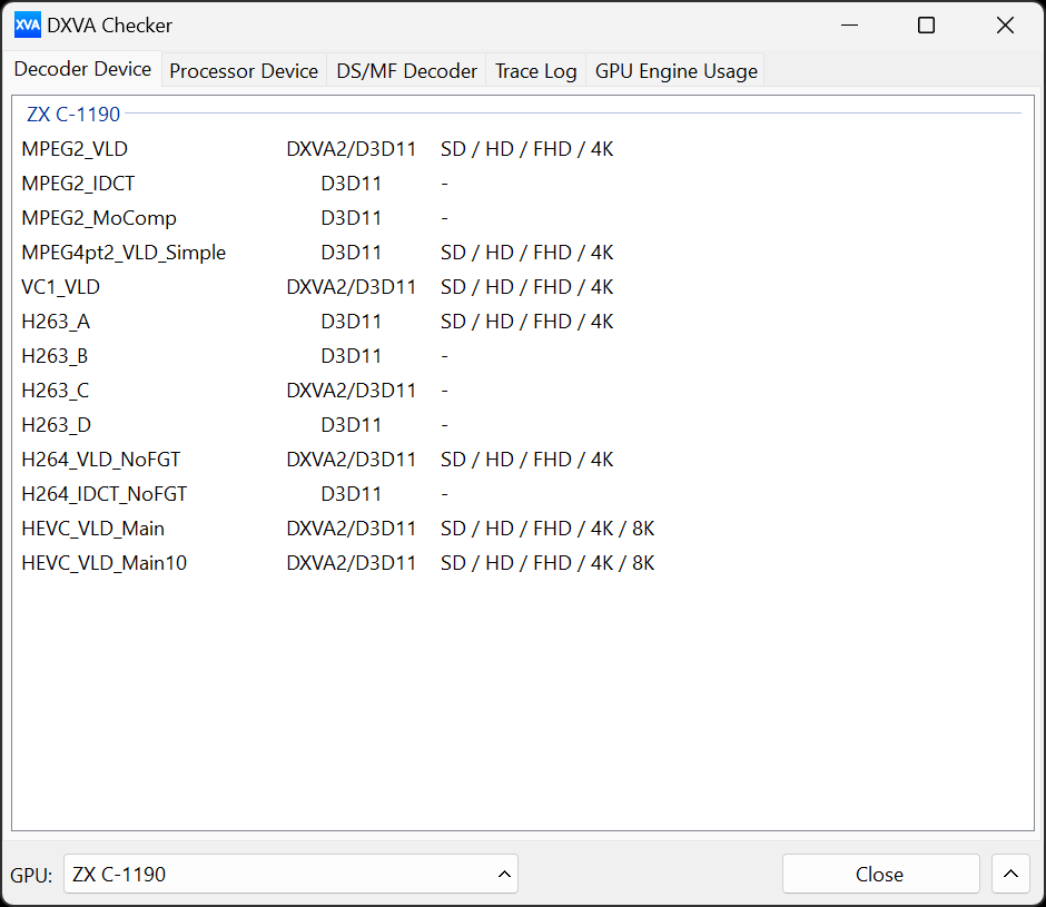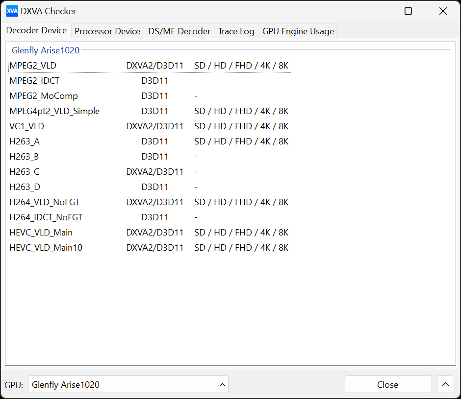 Вот такие данные о видеокарте Arise 1020 приводит утилита GPU-Z — основные сведения тут есть, пусть возможности мониторинга и крайне урезанные. Если верить этим данным, то этот GPU при частоте 567 МГц имеет скорость текстурирования 18,1 гигатекселей/с и скорость заполнения сцены 9,1 гигапикселей/с, что не близко по уровню даже к очень старым видеокартам Nvidia и AMD. Встроенное же видеоядро ZX C-1190 утилита не распознает вовсе. Зато можно узнать о поддержке аппаратного видеодекодирования — по данным утилиты DXVA Checker, имеющиеся в системе графические процессоры поддерживают аппаратное декодирование таких форматов, как MPEG2, H.264 и H265 (HEVC), есть лишь разница по разрешению — внешняя Arise 1020 умеет декодировать данные в 8K-разрешении, а встроенный GPU — только 4K.