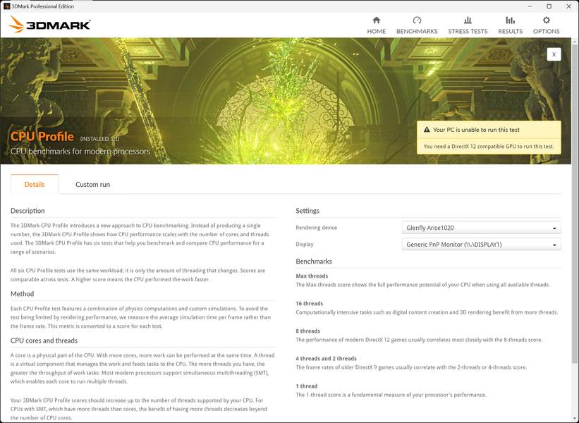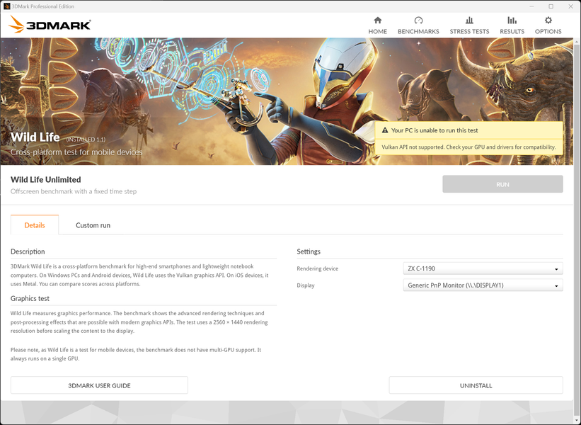 А вот 3D-производительность встроенного в KX-7000 ядра под наименованием ZX-C1190 и внешней видеокарты Arise 1020 довольно любопытна, хотя и наверняка также не особо впечатлит нас. Изначально мы хотели протестировать внешнюю видеокарту и интегрированный GPU компании Zhaoxin и в игровых приложениях, и в 3DMark, но даже в последнем на китайских видеоядрах работали далеко не все тесты — просто из-за того, что Arise 1020 не поддерживает DirectX 12 (не говоря уже о де-факто обязательных современных особенностях, вроде трассировки лучей), а используемые драйверы ZX-C1190 явно неидеальны по поддержке Vulkan: