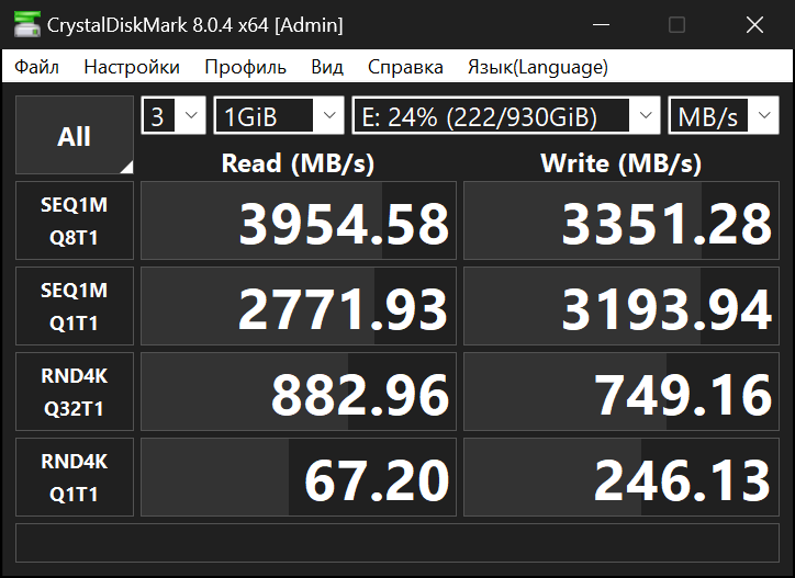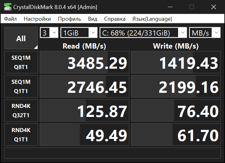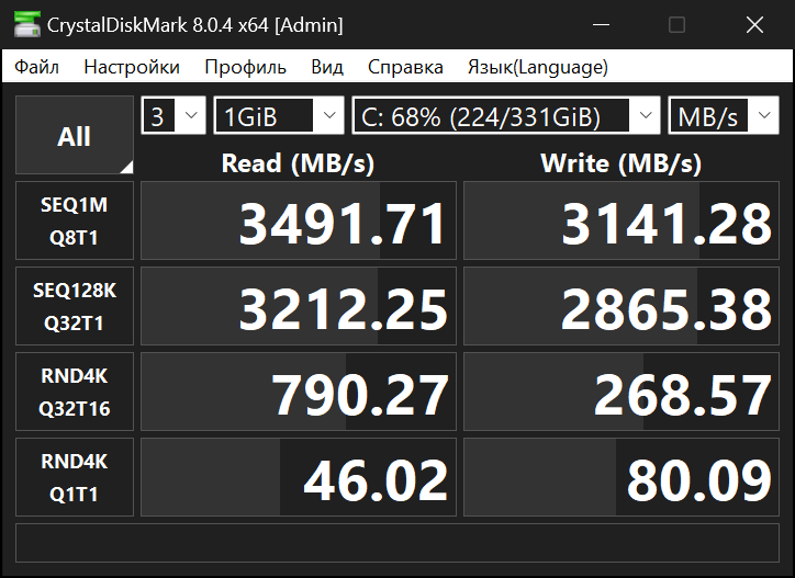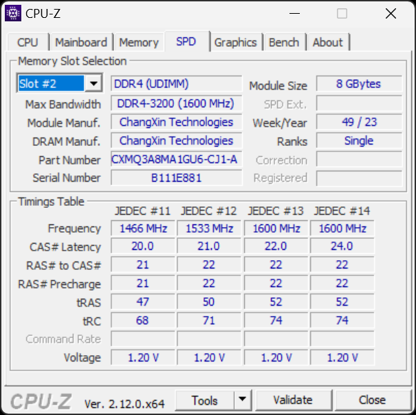 Модулей памяти CXMT CXMQ3A8MA1GU6-CJ1-A в системе установлено два, они работают в двухканальном режиме DDR4-3200 — скорость передачи данных из памяти по умолчанию зафиксирована на уровне 3200 МТ/с, и никаких настроек в BIOS нет. Также установлен твердотельный NVMe-накопитель Biwin AP860 512 ГБ, и еще один NVMe-накопитель можно установить в дополнительный разъем M.2 при необходимости — и мы как раз использовали второй накопитель Solidigm P41 Plus для дополнительных тестов в Windows. Системная плата дополнительно предлагает три порта SATA 3.0, все из которых свободны. Вот данные CPU-Z об установленной памяти, она не имеет предустановленных XMP-профилей, только JEDEC, и стандартно работает на частотах до DDR4-3200 со следующими таймингами: