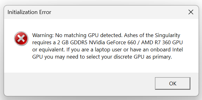 - Ashes of the Singularity — DX12-версия игры выводит предупреждение на старте и затем виснет, DX11-версия также пишет предупреждение, затем запускается и зависает или вылетает при запуске игрового процесса из меню.