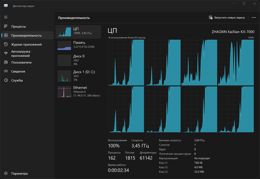 В диспетчере задач Windows для процессора KaiXian KX-7000 указана единая «базовая скорость», являющаяся в реальности скорее максимальной частотой некоторых ядер — 3,6 ГГц, а на деле лишь два ядра из восьми могут работать на такой частоте, а максимум для остальных находится на более низком уровне в 3,4 ГГц. И средняя частота для всех ядер получается 3,45 ГГц, что и отмечает отдельно тот же диспетчер задач при 100% загрузке ядер. В целом, все данные о процессоре и тут более-менее соответствуют тому, что рассказывает публике о возможностях своего процессора китайская компания Zhaoxin, так что давайте перейдем к тестам.