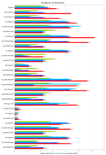 Если сравнивать с более мощным ядром Comet Lake, в котором у Intel еще не было деления на производительные и эффективные ядра, то KX-7000 медленнее его более чем на 20% в среднем, и превосходства в отдельных операциях стало сильно меньше. Темп исполнения тех же миксов FPU-инструкций уже ниже, да и по многим AVX/SSE операциям есть проседание. Ну и Zen 3 тут самый быстрый, конечно же — это касается как средних значений, так и смеси FPU-инструкций. В среднем по всем тестам далеко уже не новое ядро Ryzen 5000 опередило творение китайцев более чем в полтора раза — то есть, даже на одинаковых частотах старое западное ядро было бы намного быстрее. И по сравнению с Ryzen 5000, у китайского ядра в сильных сторонах остались лишь некоторые SSE-операции над 128-битными числами, а во всех остальных случаях старое ядро AMD по показателю IPC куда быстрее. По этим тестам получается, что ядро Zhaoxin не такое уж плохое, и в реальных тестах его подводит скорее плохая работа с памятью и кэшированием данных.