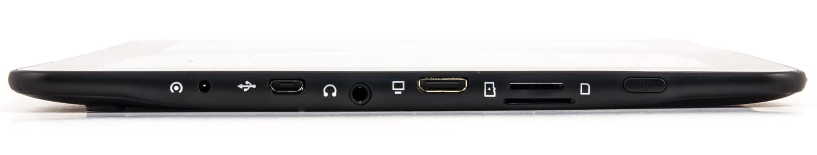 Все разъемы планшета сосредоточены на левой грани: гнездо адаптера, Micro-USB, 3,5-мм разъем для наушников, Mini-HDMI. Завершают набор тесно размещенные подпружиненные открытые слоты для SIM и карты памяти. Карточки устанавливаются неглубоко и не требуют для этого подручных инструментов. Кнопка включения имеет гораздо более удобную форму, чем качелька громкости.