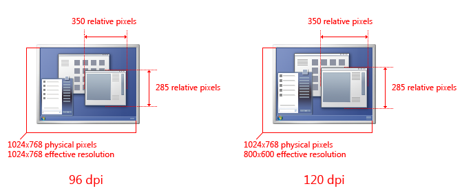 Современные версии Windows предлагают два алгоритма масштабирования: старый, который управляет масштабом системных элементов, но оставляет масштабирование собственных ресурсов приложения на его усмотрение, и новый (впервые представленный в Windows Vista), который, благодаря виртуализации dpi, позволяет сохранить интерфейс приложения в полностью оригинальном виде при любом масштабе — пусть и ценой некоторого ухудшения качества изображения.
