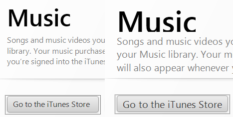 У iTunes действительно есть проблемы с масштабированием. В базовом разрешении 96 dpi все выглядит отлично. На 120 dpi все вроде бы еще хорошо, но если обратить внимание, низ слова Music срезан. Это как раз тот пограничный случай между старым и новым механизмами масштабирования, когда нарушения разметки уже есть, но еще не критичны. В этом случае стараются использовать старый механизм, вполне резонно полагая, что лучше пусть немного нарушится разметка, чем станут расплывчатыми все шрифты.