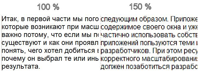 Теоретически эта проблема должна легко решаться средствами приложения, тем более что Dreamweaver позволяет изменять масштаб страницы (в этом случае изменится размер и шрифтов, и колонки), у него есть соответствующая настройка (gif со сравнением ширины колонки при 100 и 150%). Но если поставить 150% внутри приложения, то получается полный кошмар со шрифтами. Причем абсолютно при любых настройках DPI.