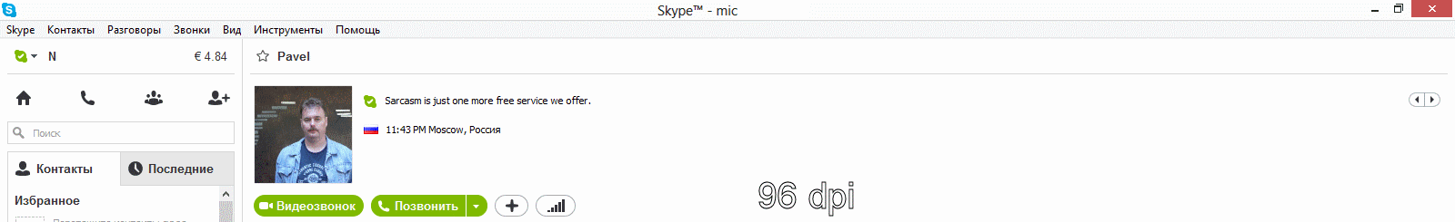 Помимо того, в Skype мы наблюдаем тот же эффект, что и в других приложениях: если выставить 144 dpi (150%) и оставить галочку для использования старого механизма, то все шрифты в окне возвращаются к исходному размеру под 96 dpi, и на экранах с высокой плотностью пикселей придется сидеть с лупой. Вообще, непонятно, почему при таком высоком DPI еще работает старый механизм, но это, скорее, вопрос к разработчикам Windows.