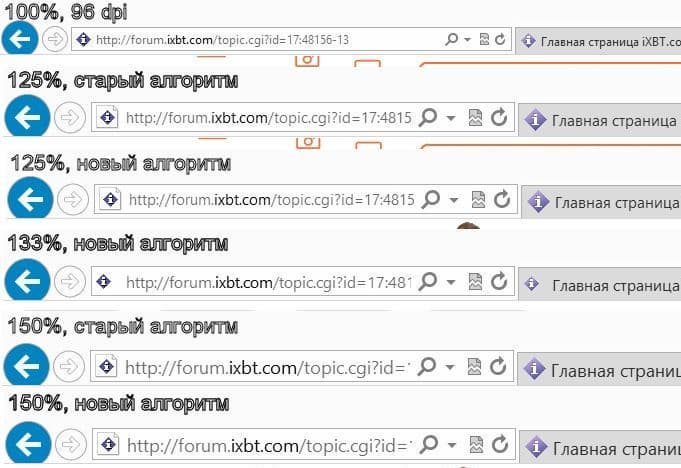 Причем та же судьба ждет и текст в окне — он становится крупнее, но размывается. Вот сравнение старого и нового алгоритмов при 120 DPI (125%):