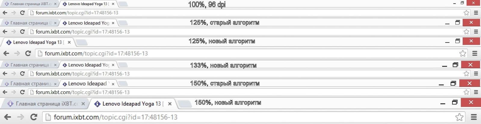 Раз Google Chrome не оптимизирован под масштабирование (этот факт у меня как-то не укладывается в голове), то Windows включает для него свой алгоритм. Это сразу видно по размытому тексту. Шрифты и вкладки становятся большими, но зато размываются текст и линии.