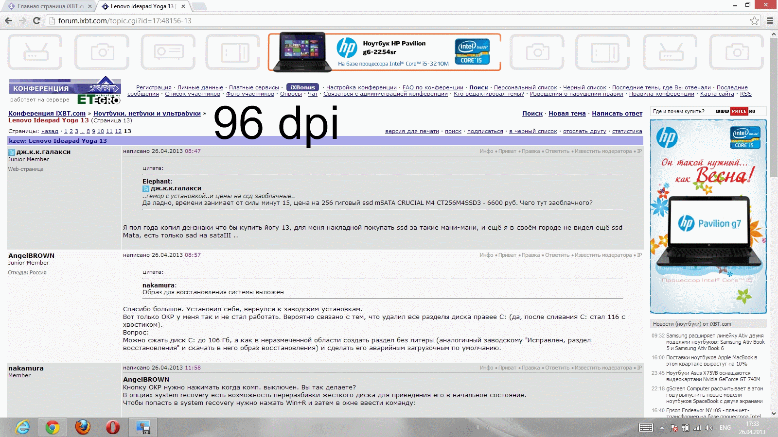 А вот на форуме левая и правая колонки стали пропорционально больше, а средняя уменьшилась (gif-анимация). И опять изменение DPI не влияет на содержимое страницы. На главной странице изменился внешний вид логотипа в левом верхнему углу. Обратите внимание, он стал немного более размытым, хотя ему это вроде даже пошло на пользу. Фотографии в новостях тоже стали чуть размытыми, а вот флэш-баннер справа остался четким.