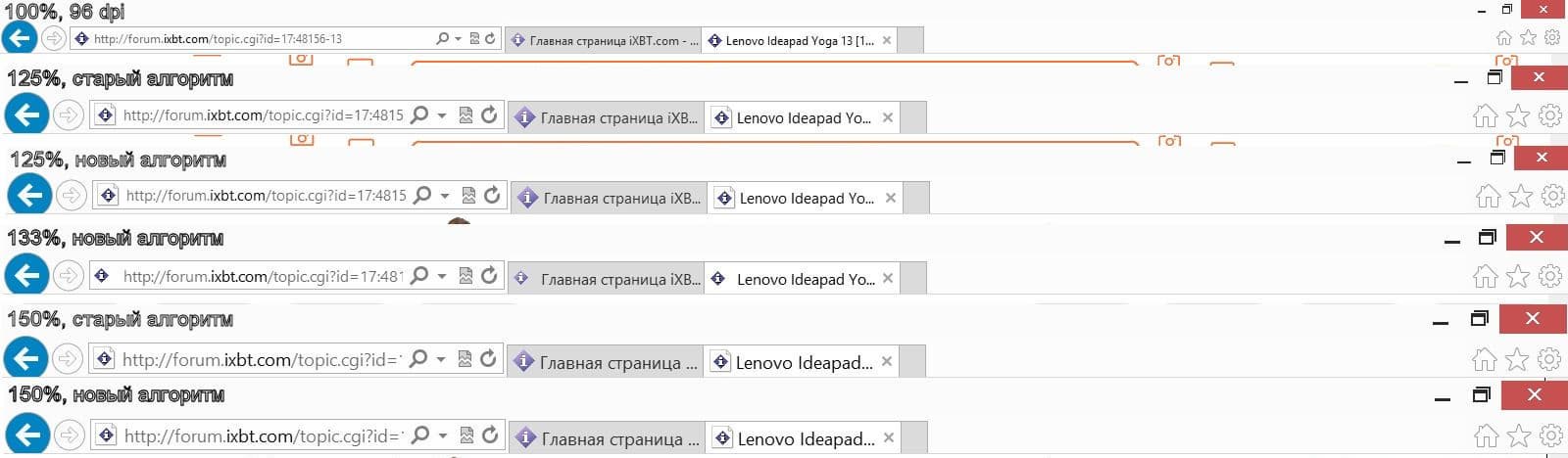 При переходе с 96 на 120 DPI интерфейс увеличивается абсолютно корректно. Интересно, что в IE10 (по-моему, единственном из участников тестирования) при увеличении DPI увеличиваются иконки сайта в заголовке закладки. В частности, поэтому немного увеличивается вертикальный размер вкладок. Для 133% используются те же иконки, что и на 96 DPI (видимо, чтобы не испортить некорректным масштабированием), а на 144 DPI они увеличиваются до того же размера, что и при 120 DPI.