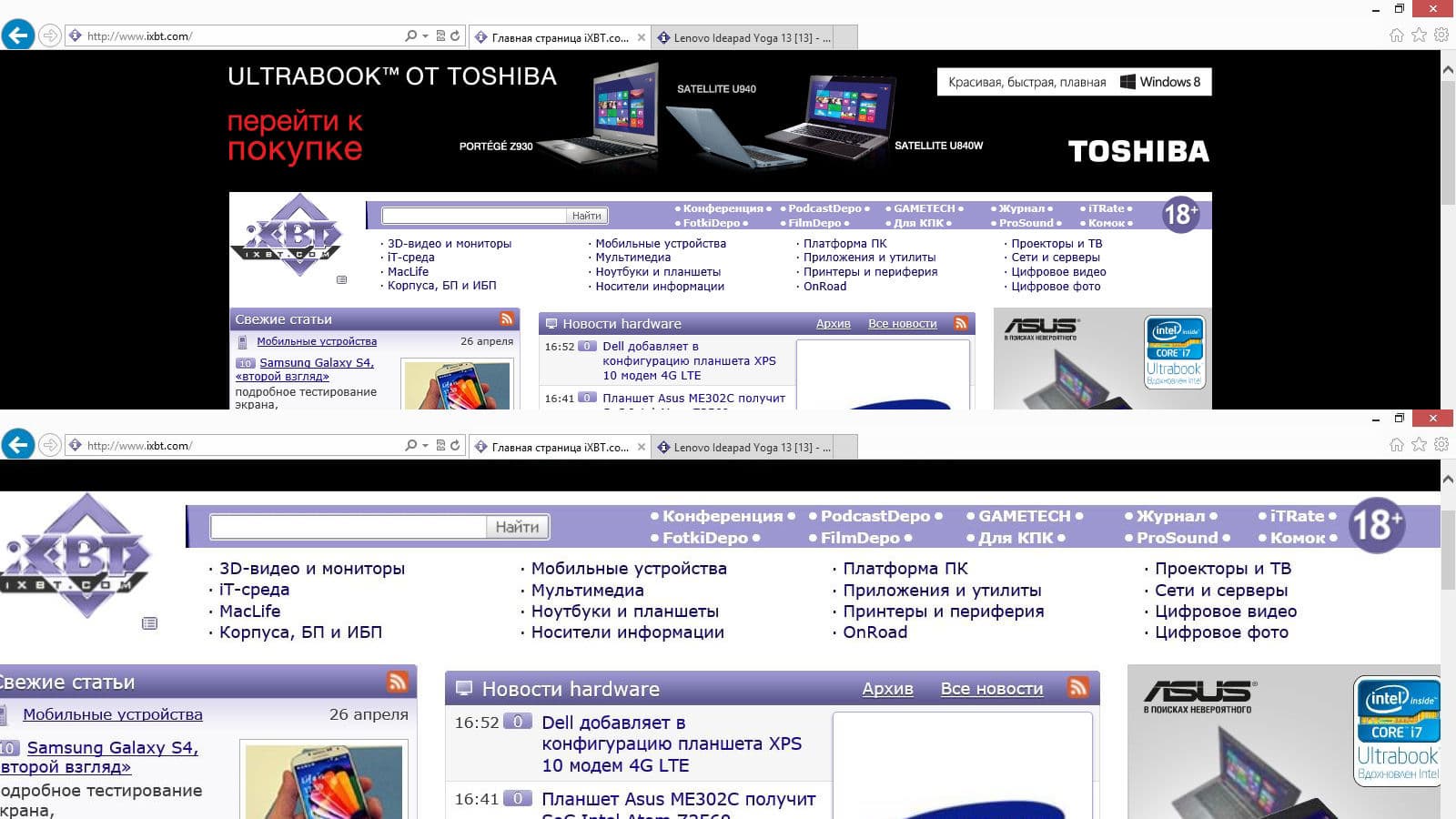 Так, при отсутствии поддержки масштабирования даже элементы интерфейса становятся слишком мелкими: неудобно читать мелкие шрифты, неудобно работать и даже кликать мышкой, не говоря уж об использовании пальца. Поэтому на Aspire S7, например, моим любимым браузером стал IE10… Впрочем, это мы забегаем вперед.