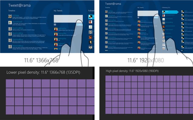- Для нового интерфейса Windows 8 и большинства приложений под него разрешение Full HD на экране с диагональю 11,6 дюйма не увеличивает доступное экранное пространство для размещения информации — оно остается таким же, как в случае разрешения 1366×768. Увеличивается качество отображения элементов на экране. Количество информации, скорее, зависит от физического размера экрана, а не от его разрешения.