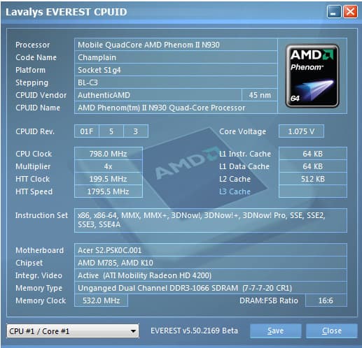 В качестве процессора установлен 4-ядерный Phenom II N930 с частотой 2,0 ГГц и кэш-памятью второго уровня по 512 КБ на ядро. В отличие от Phenom II для настольных компьютеров, кэш-памяти третьего уровня у процессоров из мобильной линейки не имеется, то есть они являются скорее аналогами Athlon II. Однако это вполне укладывается в типичное позиционирование мобильных процессоров, которые всегда являются упрощенными в той или иной степени по отношению к одноименным процессорам из «настольной» серии. Но зная из тестов настольных процессоров о том, что отсутствие кэша L3 отнюдь не фатально с точки зрения производительности процессоров на архитектуре AMD K10, можно предположить, что производительность такого процессора будет все равно достаточно высокой.