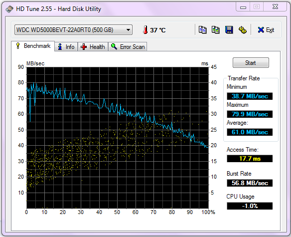 Винчестер демонстрирует достаточно хороший результат по меркам современных ноутбучных дисков с частотой вращения 5400 об./мин.
