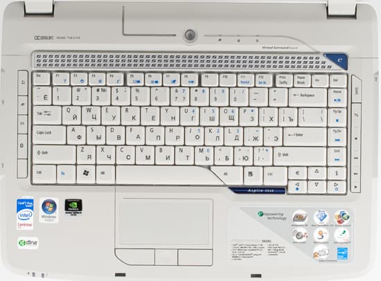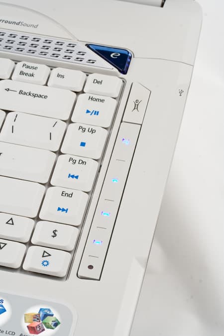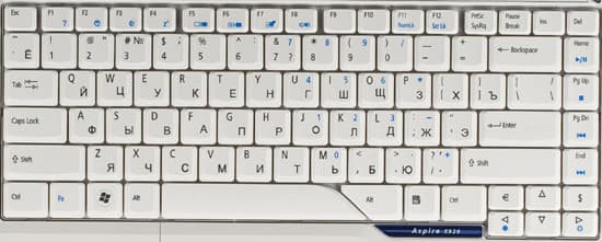 Очень удачным оказалось решение вынести дополнительные клавиши по бокам клавиатуры. Ими чрезвычайно удобно пользоваться, а по левым клавишам можно следить и за состоянием интерфейса. Было бы совсем здорово, если бы справа была бы такая же линейка клавиш быстрого запуска приложений, как и слева, а сенсорные клавиши управления медиаплеером вынесли бы на место над клавиатурой. Также по краям клавиатурной панели нанесены иконки разъемов, которые находятся в этом месте на боковой грани — находить очень удобно, не надо наклоняться и смотреть на боковую грань ноутбука. Вроде бы мелочи, но это значительно повышает удобство работы с 5920.