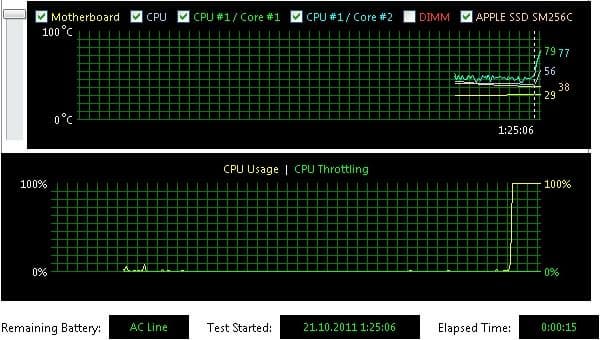 В дальнейшем Turbo Boost немного понервничал при пересечении уровня температуры процессора отметки в 80 градусов и опустил уровень разгона до 2,2 ГГц, но потом восстановил его и держал до конца теста. График температуры при этом выглядел вот так: