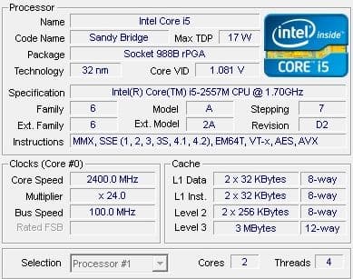 Итак, в S3 установлен процессор Intel Core i5-2467M, в MacBook Air — Core i5-2557M. Разница, в соответствии со спецификациями, составляет 100 МГц (1600 против 1700 МГц) в номинальном режиме и 400 МГц (2300 против 2700 МГц) — в разогнанном. Кстати, напоминаю, это максимальные цифры при загруженности одного ядра, если загружены все четыре — уровень разгона будет меньше. Остальные характеристики одинаковые, вплоть до рекомендованной цены (и там, и там 250 долларов). TDP у обоих процессоров тоже одинаковый и составляет 17 Вт.