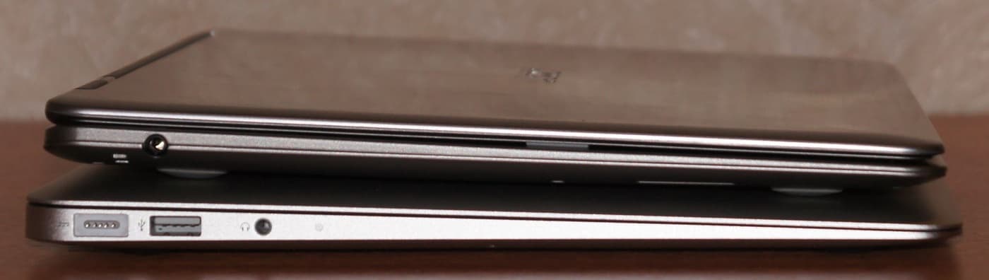 По удобству расположения портов и вообще работы с ними Air далеко впереди. Для сравнения посмотрим на два ноутбука, что называется, совсем близко. Вот фотографии сторон корпуса с разъемами: