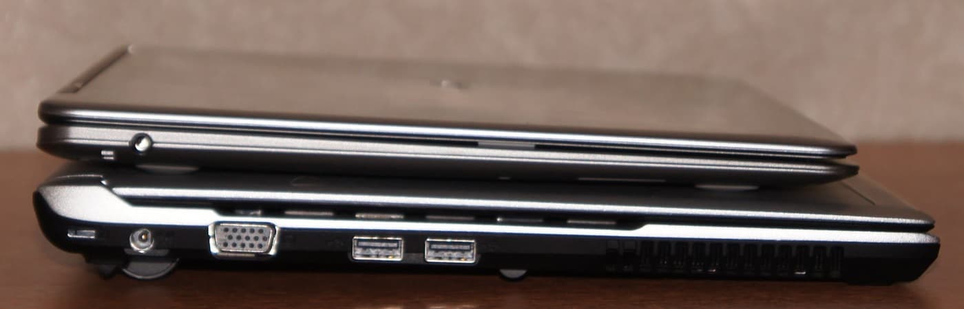 Обратите внимание, что верхний край матрицы у обоих ноутбуков на одинаковом уровне, но при этом глубина корпуса у Aspire S3 меньше.
