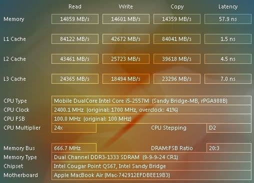 Air получает также большое преимущество в скорости работы с кэшем разных уровней. Происходит это, видимо, потому, что 2467М разогнался всего до 2 ГГц (25% прироста по данным нашего теста), а вот 2557М — до 2,4 ГГц (41% прироста).