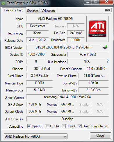 | Видеокарта | Radeon HD 6755G2 | Radeon HD 6540G2 | GMA HD3000 | Radeon HD 7660G |