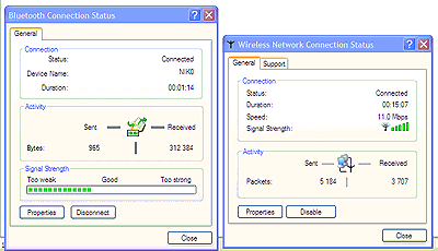 При этом беспроводные адаптеры прекрасно уживаются друг с другом (на скриншоте момент совместной работы). Напомню, что при разработке сетевого интерфейса Pro/Wireless 2100 компанией Intel была реализована специальная технология, снижающая взаимные помехи между оборудованием 802.11 и некоторыми устройствами Bluetooth. Крупномасштабных полевых испытаний я не проводил, но в офисных и домашних условиях проблем не возникало.
