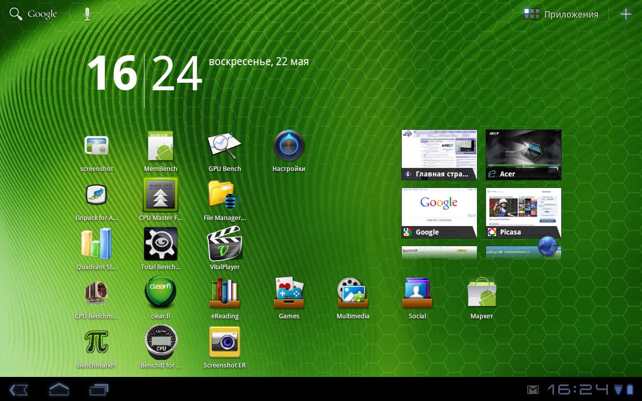 О самой ОС Android 3.х мы рассказали вам в отдельной статье, так что рекомендуем ознакомиться с ней, если по какой-то причине вы ее пропустили. Но в статье про Acer Iconia Tab A500 мы все равно не можем обойтись без небольшого описания «софтовых» особенностей.