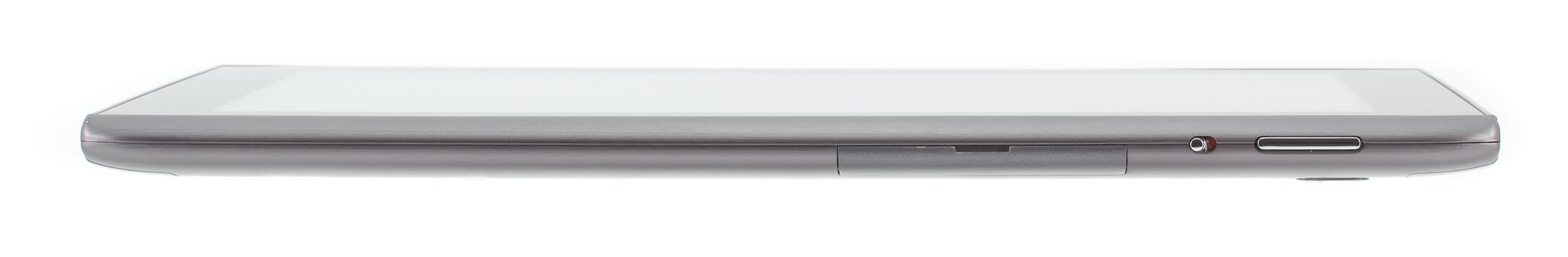 На верхней грани устройства мы видим (справа налево): качельку регулировки громкости (весьма тугую), рычажок блокировки смены ориентации экрана, а также разъем для карт microSD, спрятанный под неоправданно длинной крышечкой (в моделях с 3G-модулем под этой же крышкой рядом со слотом для microSD располагается слот для SIM-карт).