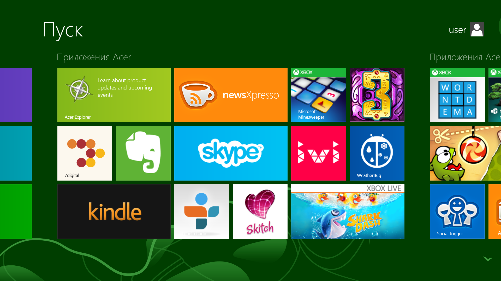 Но гораздо интереснее посмотреть на комплектные программы для интерфейса Metro, собранные в отдельном разделе «Приложения Acer» на рабочем столе. Познакомиться с некоторыми из них можно в программе Acer Explorer, существующей сейчас, к сожалению, только на английском языке. Традиционно предпочтение отдано клиентам для доступа к мультимедийным, новостным и другим медиасервисам. Из знакомых названий отметим Evernote, Kindle, TuneIn Radio, WeatherBug, ivi.ru. В разделе «Игры» есть пара продуктов Microsoft (Minesweeper и Mahjong), The Treasures of Montezuma 3, Shark Dash и известный проект Cut the Rope. Также присутствует утилита для рисования Sketch. Для работы с web-камерами пригодится Acer Crystal Eye, основанная на технологиях компании Cyberlink.