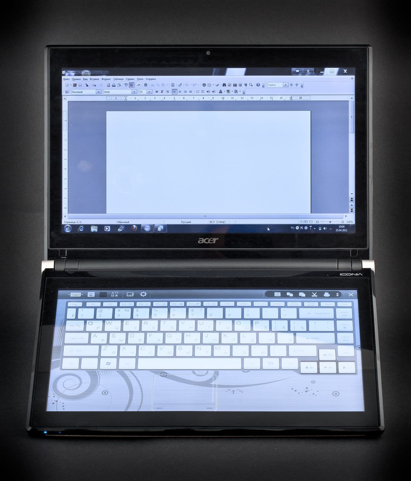 Однако самый большой сюрприз поджидает неподготовленного пользователя при открытии крышки: у Iconia напрочь отсутствует клавиатура, вместо нее расположен второй экран.