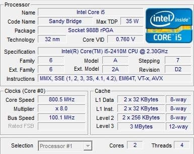 | Процессор | DualCore Intel Core i5-2410M, 2300 МГц (23×100) |