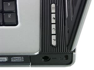 При этом кнопки, в отличие от TravelMate 3200, сделаны серебристыми, а не выполнены в одном стиле с индикаторами. Правда, размер их при этом не увеличился кнопки по-прежнему мелковаты. А вот небольшой кнопкой включения питания пользоваться, на удивление, удобно, да и смотрится она эффектно, особенно подсвеченная зеленым светом при включенном ноутбуке.