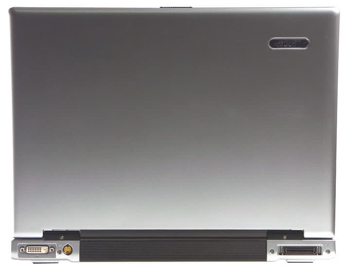 Дизайн ноутбука выполнен в том же новом фирменном стиле Acer, который мы видели в модели TravelMate 3200. Правда, у TravelMate 8100 присутствует традиционная защелка крышки, а корпус еще более напоминает стильную папку. Большую часть заднего торца занимает аккумуляторная батарея. Слева от нее DVI и TV выходы, справа разъем порт-репликатора.