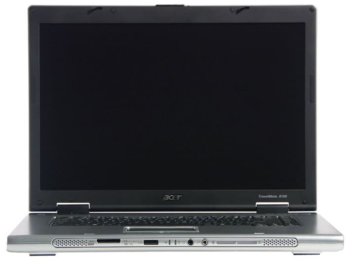 Решение переднего торца традиционно для ноутбуков Acer динамики расположены спереди, между ними кнопки-индикаторы включения/отключения беспроводной сети 802.11b/g и Bluetooth, а также индикаторы включения ноутбука и зарядки аккумуляторной батареи. Здесь же расположено окошко инфракрасного порта и картовод. Сравните, например, с моделью TravelMate 8000. На модели TravelMate 8100 блок аудиоразъемов также расположен спереди. Все бы хорошо, но вот переднее расположение оптического S/PDIF выхода мне не нравится.