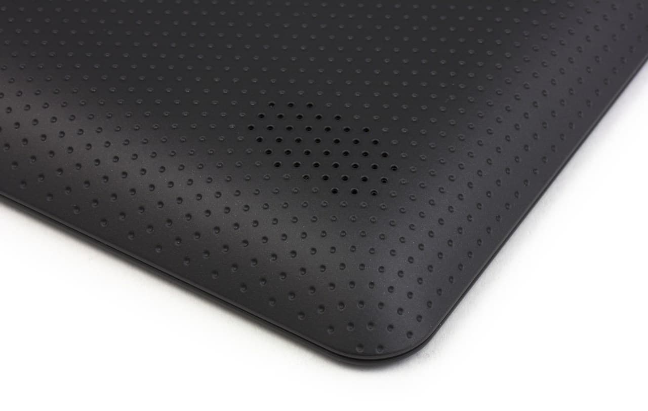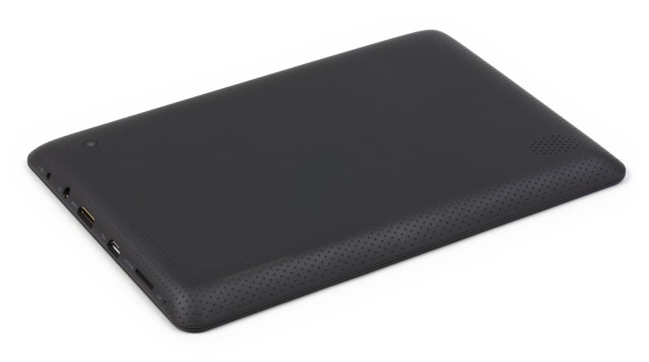Задняя панель сделана из текстурированного темно-серого пластика, на ощупь не вызывающего неприятных ощущений. Сальные разводы на ней становятся лишь немного заметны при прямом освещении. Благодаря тому, что задняя панель существенно скошена, планшет удобно держать, обхватив его снизу пальцами одной руки.