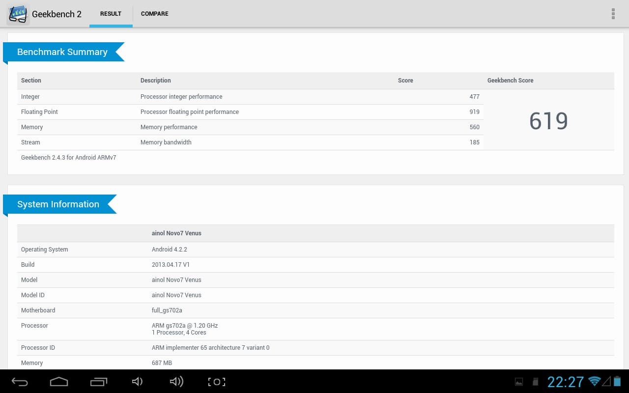 Комплексный Geekbench увидел у Venus только 687 МБ RAM и логично наградил его лишь 619 баллами. Планшеты iconBIT и Google ушли далеко вперед, с 1024 и 1415 баллами соответственно.