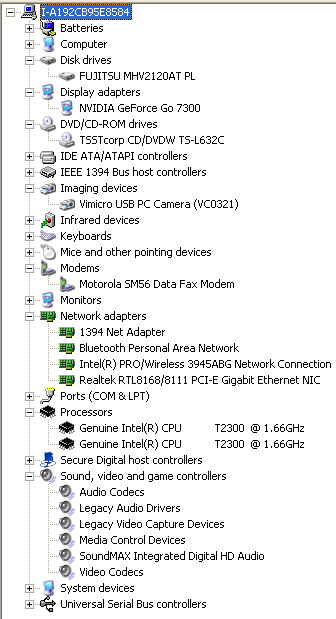 Использование младшего процессора линейки Core Duo смущать не должно для офисных задач его производительности хватает с лихвой. А дискретный (отдельный) графический контроллер наводит на мысль, что этому ноутбуку по плечу не только бизнес-приложения. Конкретные спецификации устройств, установленных на тестируемом экземпляре, можно увидеть на скриншоте вкладки Device Manager.