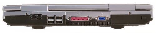 На задней стенке мы видим вполне своеобычные замок Кенсингтона, выход на внешний монитор и порт LPT, рядом с которым находится блок тесно сгруппированных разъемов USB 2.0 (штекеры встают хорошо, а вот подключить два самостоятельных устройства типа флэшдрайвов- уже проблема). И завершается парад сгруппированными вместе сетевым и модемным разъемами.