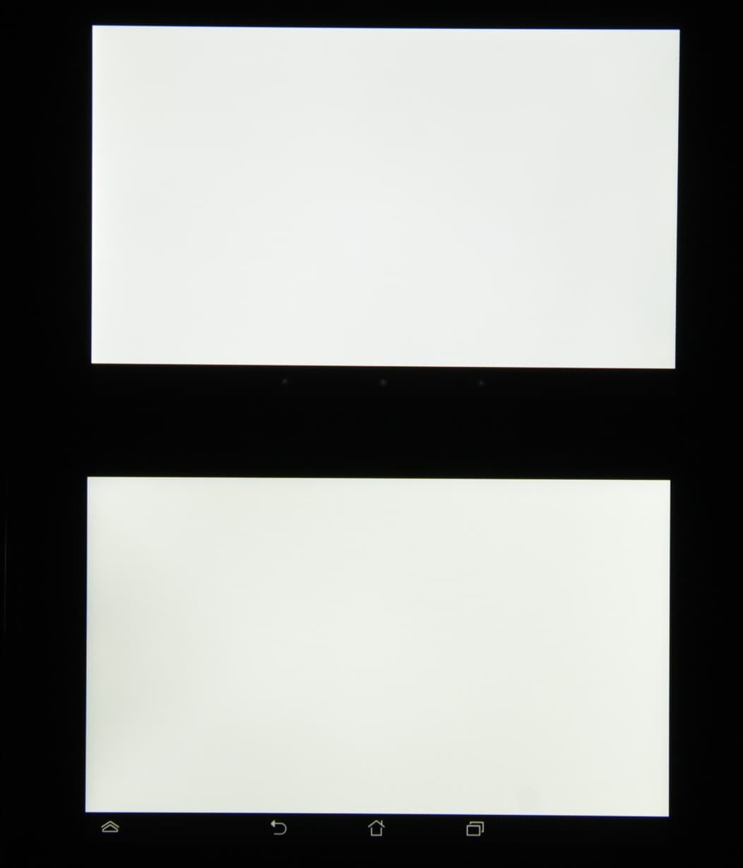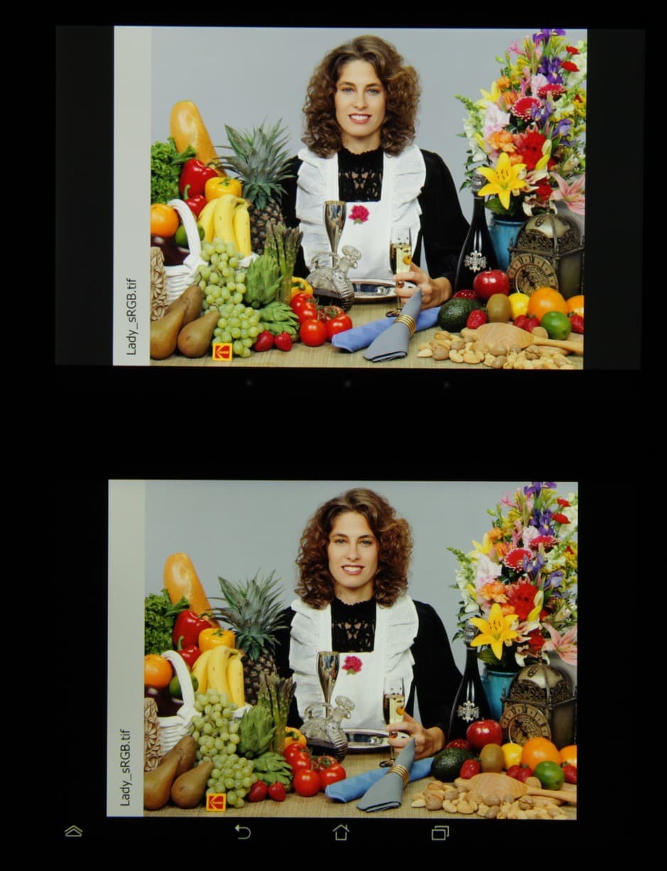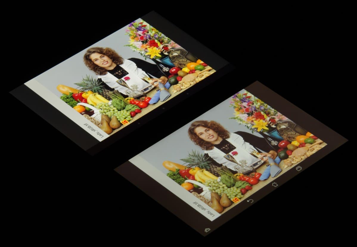 Экран имеет хорошие углы обзора без инвертирования оттенков и без значительного сдвига цветов даже при больших отклонениях взгляда от перпендикуляра к экрану. Для сравнения приведем фотографии, на которых на экраны Nexus 7 (сверху) и тестируемого планшета (снизу и у него на экране всегда высвечиваются иконки кнопок) выведены одинаковые изображения, при этом яркость обоих экранов установлена примерно на 200 кд/м². Перпендикулярно к экранам тестовая картинка:
