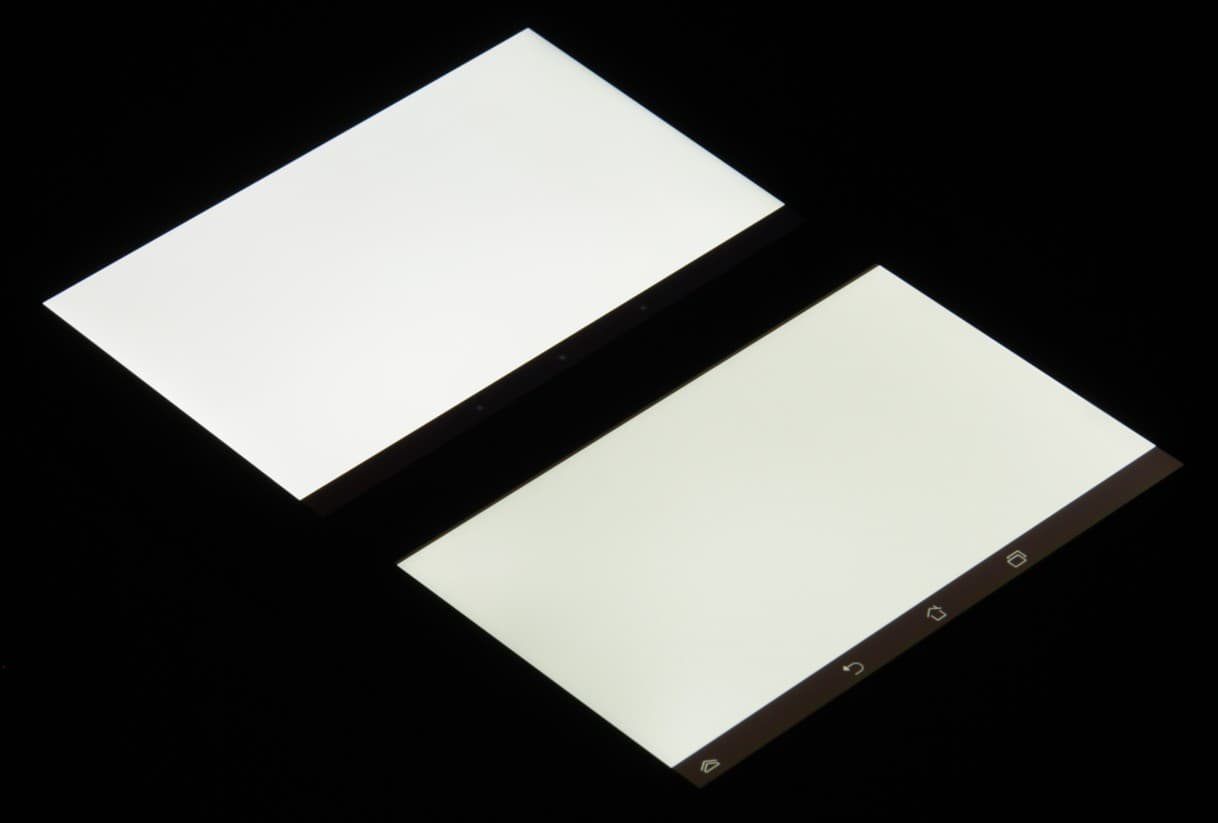Лицевая поверхность экрана выполнена в виде стеклянной пластины с зеркально-гладкой поверхностью, устойчивой к появлению царапин. Судя по отражению объектов, имеется какой-то антибликовый фильтр, который по снижению яркости отражения заметно хуже, чем у Google Nexus 7 (2013) (далее просто Nexus 7). Поверхность самой матрицы под стеклом слегка матовая, поэтому экран отражает как прямые источники света (внешней поверхностью), так и рассеянный свет (поверхностью матрицы), это уменьшает читаемость в условиях сильной внешней засветки. Для наглядности приведем фотографии, на которых в выключенных экранах обоих планшетов отражается белая поверхность (Asus Fonepad 7 — слева):