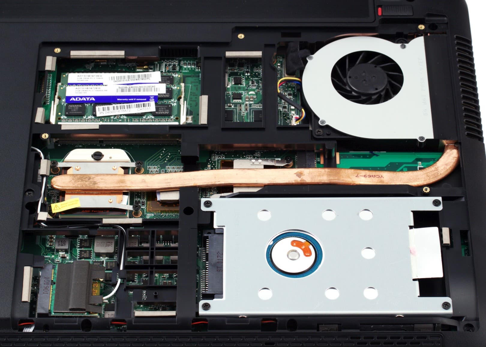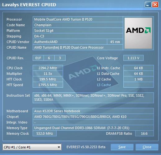 К нам ноутбук поступил с относительно редко устанавливаемым процессором Turion II P520: это один из самых мощных двухъядерных процессоров в современной мобильной линейке от AMD, при этом обходится низким уровнем тепловыделения (25 Вт). Идеологический аналог моделям Phenom II 500-й серии для настольных ПК. В качестве вариантов комплектации доступны также трехъядерный Phenom II N830 и четырехъядерный P920, а для тех кто стремится к экономии, есть вариант с двухъядерным Athlon II и даже одноядерным V120. Также пользователь может выбрать объем жесткого диска и модель либо со стандартной частотой вращения 5400 об/мин или — на 7200 об/мин. Видеокарта во всех случаях используется дискретная: Radeon HD 5470 с 1 ГБ видеопамяти. Ноутбук в доставшейся нам комплектаци согласно предложенной AMD градации соответствует уровню Vision Premium.