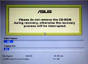 L4H первая попавшая на наш тест модель ноутбука от ASUS, в комплект которой входит пакет восстановления системы. Естественно, я воспользовался случаем и проверил, как она работает. Надо сказать, система сделана достаточно удачно. Загружаемся с первого диска пакета и попадаем в Startup-меню, где предлагается выбор варианта восстановления (возможно создание на жестком диске двух разделов). После выбора программа пару раз спрашивает, действительно ли мы хотим все восстановить, и предупреждает, что данные будут уничтожены. После получения положительного ответа загружается графическая оболочка и дальнейшие действия пользователя сводятся к замене дисков.