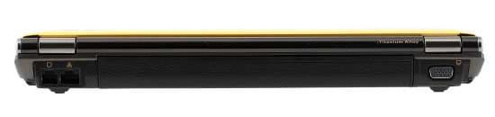 Задняя панель почти полностью занята батареей. Напоминаем, с VX3 поставляются две батареи — трехэлементная (она маленькая и не выдается из корпуса) и девятиэлементная, она из корпуса выступает. Батареи сзади и снизу также отделаны кожей, видимо, чтобы ноутбук удобнее было держать в руке.