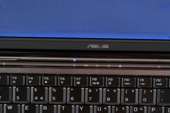 Слева направо: индикатор работы ноутбука (светится голубым при работе ноутбука, мигает в режиме сна), индикатор работы батареи (синий, красный), индикатор включения беспроводных интерфейсов (голубой Wi-Fi, красный Bluetooth, при активации обоих интерфейсов горят оба диода, свечение получается пурпурным), индикатор обращения к жесткому диску, индикатор Caps lock. Под индикаторами находятся очень четко видимые иконки. Свечение индикаторов яркое, в темноте немного бьет по глазам.