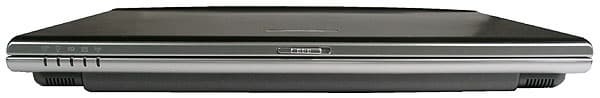 Спереди защелка крышки и блок индикаторов. Визуально ноутбук кажется тоньше из-за того, что днище уже, чем корпус.