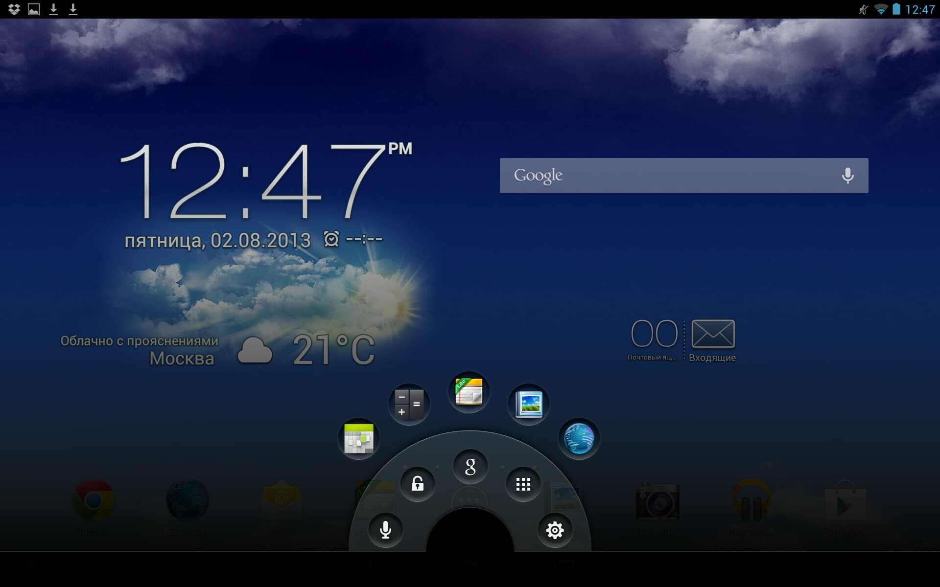 Операционная система была немного видоизменена: разработчики ASUS добавили на нижнюю панель дополнительную кнопку, которая обеспечивает быстрый доступ к специальным виджетам, привязанным к приложению. Их набор можно менять. Все это мы видели и в предыдущих планшетах ASUS, но в MeMO Pad FHD 10 добавилась еще одна возможность: сделав долгое нажатие на сенсорную кнопку Home внизу экрана, мы увидим полукруг, в котором есть иконки ряда приложений.