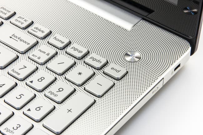 Очень светлая, практически белая клавиатурная панель выполнена из алюминия, и фактура материала дает существенный вклад в общий облик ноутбука: она создает впечатление чистоты. Правда, в N550Jv в верхней части вокруг кнопок краской нарисованы концентрические круги из точек. В первых моделях серии N они маскировали дырочки от динамиков, расположенных над клавиатурой, но в нашем ноутбуке динамиков здесь нет, так что раскраска служит чисто декоративным целям. Клавиатура у Asus N550Jv тоже светло-серебристая, примерно того же оттенка, что и клавиатурная панель.