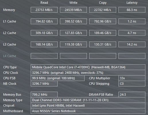 Итак, процессор имеет четыре ядра и восемь потоков. Для домашних задач такая производительность почти всегда будет избыточной, так что Asus N550Jv в этой конфигурации стоит выбирать, если вы используете какие-то ресурсоемкие или профессиональные приложения, которые умеют хорошо задействовать многоядерные процессоры. Впрочем, учитывая высокие максимальные частоты работы, этот процессор и в обычных однопоточных задачах будет показывать высокие результаты.
